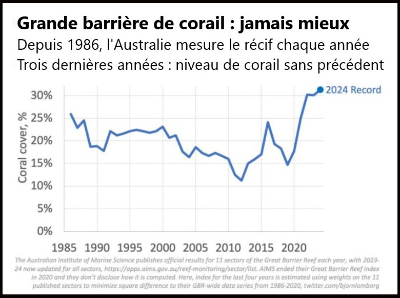 Dans les années 2000,les écologistes soutenaient que le récif de corail qui s’étend sur 2 000 km au large des côtes australiennes allait disparaître au début des années 2020 à cause du réchauffement climatique mais c'est le contraire qui s’est produit,les dernières statistiques officielles (2024) le prouvent.